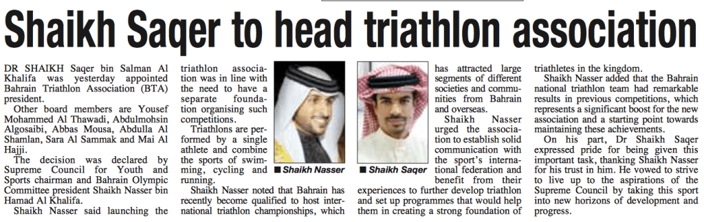 Today I am beginning a new chapter in my life. I’ve been appointed as the President of Bahrain Triathlon Association, a newly established association that overlooks the sport of triathlon in the nation. It is really an honor, with tremendous responsibilities. First and foremost I would like to extend my sincere gratitude to His Highness Shaikh Nasser bin Hamad Al Khalifa, The Chairman of the Supreme Council for Youth and Sports and The President of the Olympic Committee, for bestowing his faith and trust on me for this position and I pledge to dedicate my time and effort to develop this sport in Bahrain to ultimately benefit the citizens of this lovely island.
